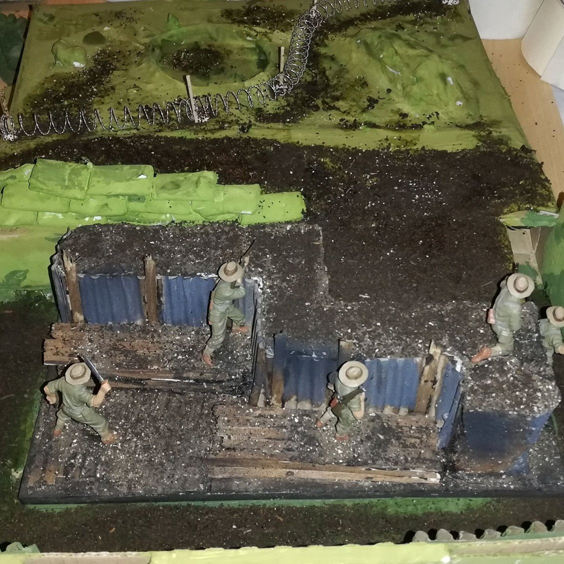 A lick of paint (ok several coats of paint), corrugated cardboard, model barbed wire, sandbags made from toilet paper and soil (aka loose leaf tea) and the model comes alive.