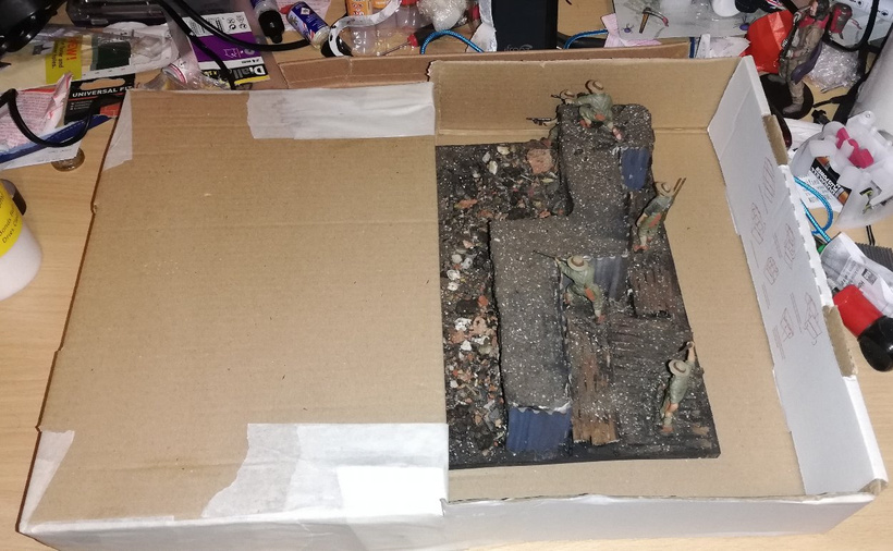 We fashioned a piece of cardboard to bridge the gap between the box and the model and made sure all the cardboard bits were securely fastened together with masking tape and PVA glue.
