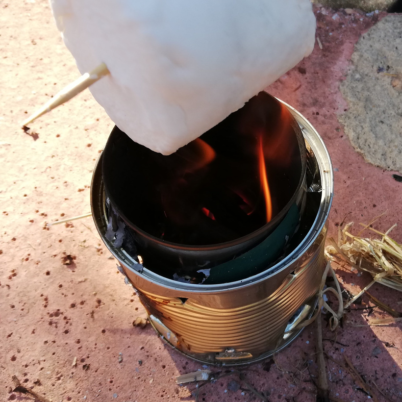 We took a new, lightweight tin can camp stove outside, loaded it up with paper and a few twigs and set it alight. Once going, we added more twigs.