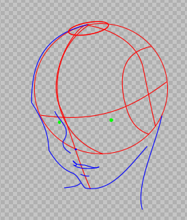One eye is ok but people tend to have two and that is where I really fall over - I just cannot get the aspect ratio right. But wait, I have a handy tutorial workpack courtesy of mikeymegamega. Now we're into the realm of using reference material and the workpack has a wonderful sheet with heads in different poses. I dragged one into an Inkscape layer and resized it. Now I can start to create a layer with some guidelines and eye positions.