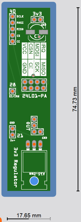 The board I'm getting fabricated is my third design. The previous two had the mounting points for both the NRF24L01P and DLP2232M boards. This made them larger, more expensive to fabricate and less flexible. This final design is far simpler and is really two small boards that work in tandem when mounted to a breadboard. If I solder female headers rather than male pins then I'll be able to use it with other boards if I decide to move away from using the DLP2232M.
